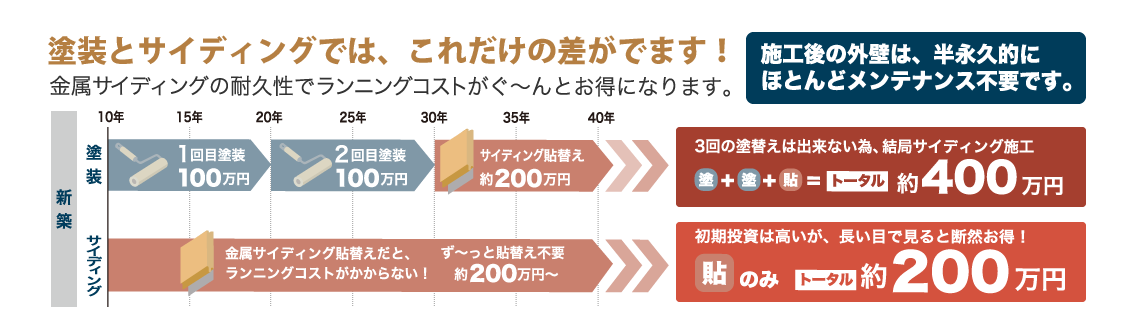 高耐久の金属サイディングで施工をした場合、初期投資は高くついてしまいますが、 生涯トータルでかかる費用を抑える事も可能なのです!