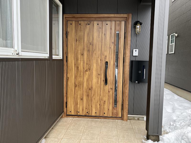 縦ラインの小幅なピッチのKMEW/ナロースパン、グラングレー+クリアゴールドの2色使いで、モダンな印象の外壁に仕上がりました。玄関ドアも新しくなり新築のように生まれ変わりました。