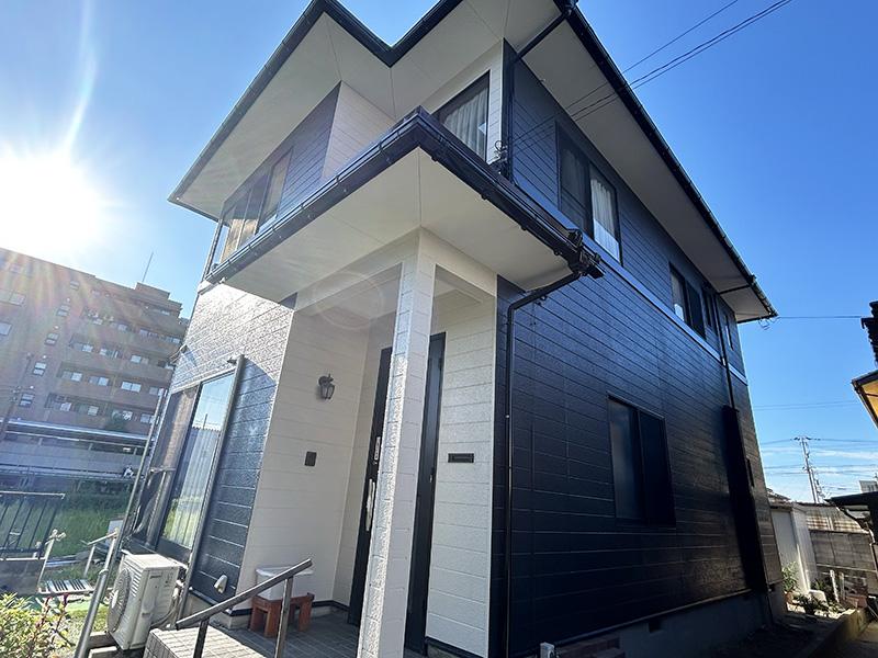 軒天井、屋根、外壁など、水を吸い込む素材のものはほとんど劣化しており、早急にリフォームが必要だと感じました。外壁、屋根ともに劣化が進行していたので、お勧めは金属サイディングでしたが、お客様とお打合せしていく中で、塗装でのお見積りもいただきたいと伺い、塗装のお見積りの中に、劣化部の補修の項目を増やし、塗装でも長く綺麗な状態が保たれるようにご提案しました。外壁の色のお打合せ時に、クールな雰囲気にしたいと伺い、私自身濃い色の外壁やモダンな色が好きなので、お客様とのお打合せも楽しくできました。濃いグレーを白系の間に黒を挟むことでコントラストがより際立って、素敵なご自宅に仕上がりました。この度は工事をお任せいただきありがとうございました。