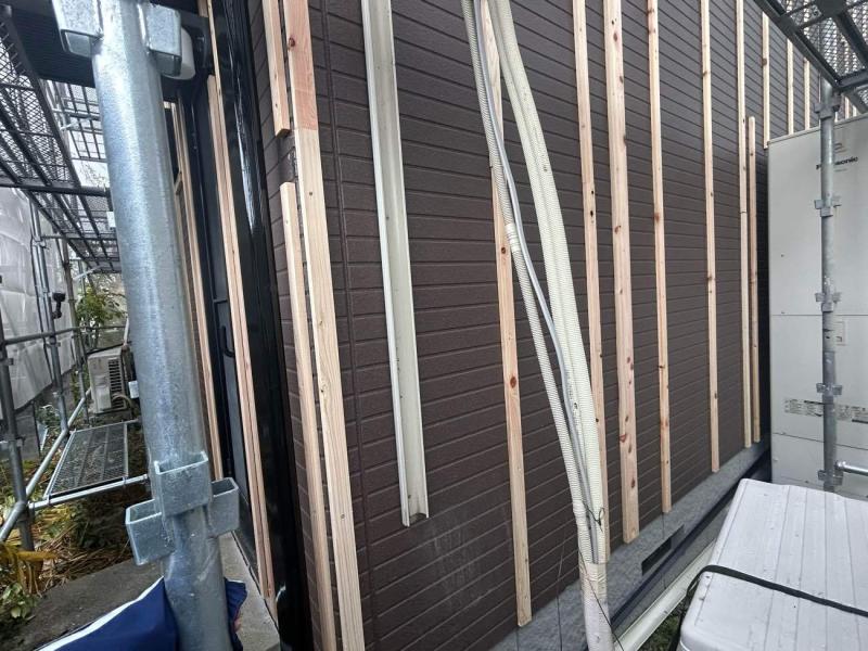 金属サイディング工事の場合は、まず下地胴縁、竪樋や電気機器の脱着です。