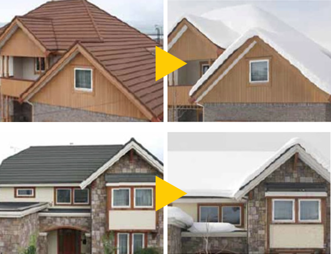 屋根表面のストーンチップの凹凸が雪を止め、急勾配の屋根でも落雪しにくくします。雪止め金具と同等の効果のある屋根材として、札幌市建築確認課でも認められています。雪国でも天然石吹付ガルバリウム鋼板屋根材「セネター」・「コロナ」を使用すれば、雪止め対策も万全です。